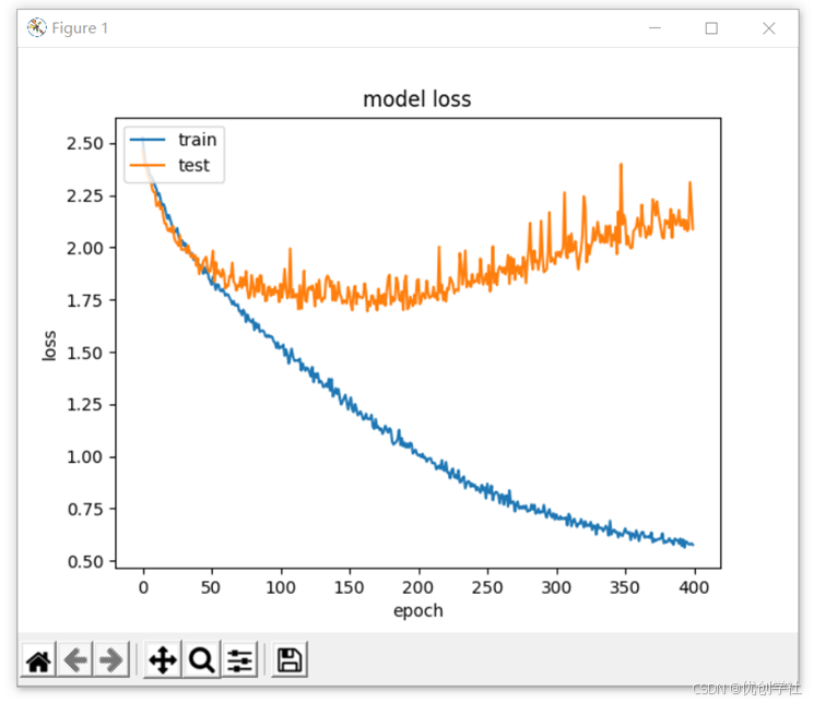 在图 3-10 中得到测试数据集和训练数据集的模型损失函数。图中表明这是在epoch=400下的模型损失函数。观察该损失模型,随着神经网络训练轮次的不断增加,训练测试集数据的损失函数在不断的降低在训练的最后损失函数降到了0.75以下。