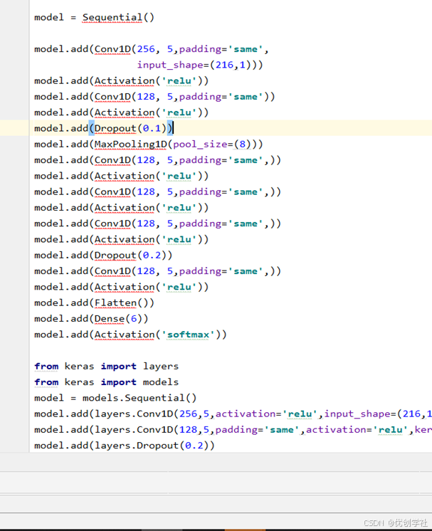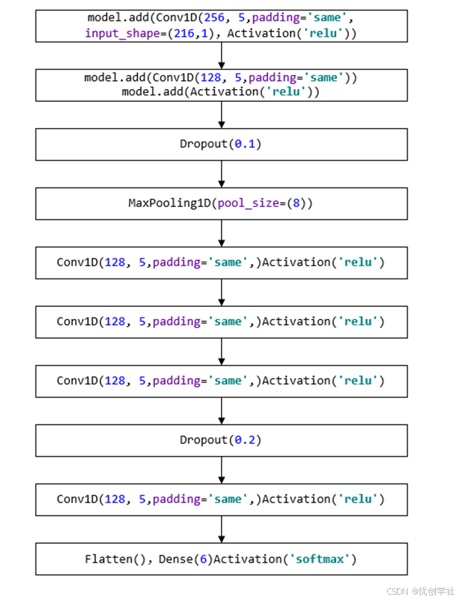 (1)首先进行一维卷积,将padding设为’same’,即允许进行填充,输入数据设置为216个一维数据。激活非线性’relu’函数。输出256张特征图,并有5层channel。