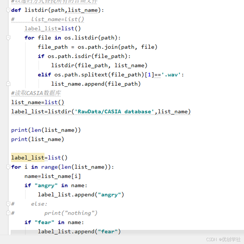 首先自定一个函数listdir,参数设置为path,list_name。path传入的是语音音频的相对地址,list_name传入的是语音音频的文件名。函数是以递归的方式进行遍历语音文件操作的。函数体listdir中先建立一个列表label_list。接着跟进一个for循环,进入该文件夹,遍历该文件夹中的文件。接着进行if判断如果还是个文件夹,继续调用本身,否则查询该文件是否有’.wav’后缀名。有的话就加入进list_name列表里。接下来就是列表里的内容进行分类操作,加上不同的六种语音标签。出现一种情绪就把标签加入,这使得每条语音都有了自己的情绪标签。