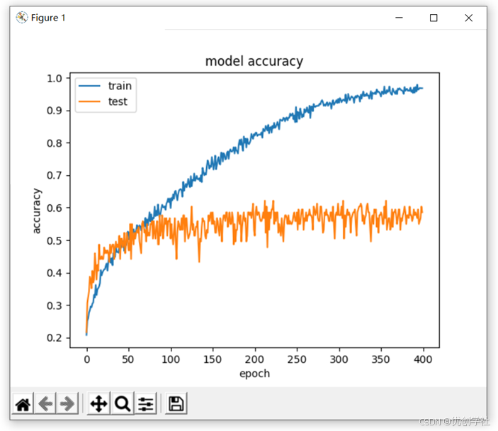 通过cnn.history[‘acc’]函数画出模型的预测数据的准确率。title表明模型准确率的名字model accuracy。ylabel表明纵轴表示准确率,xlabel表明横轴代表训练的次数,这里的次数代表训练的轮次。