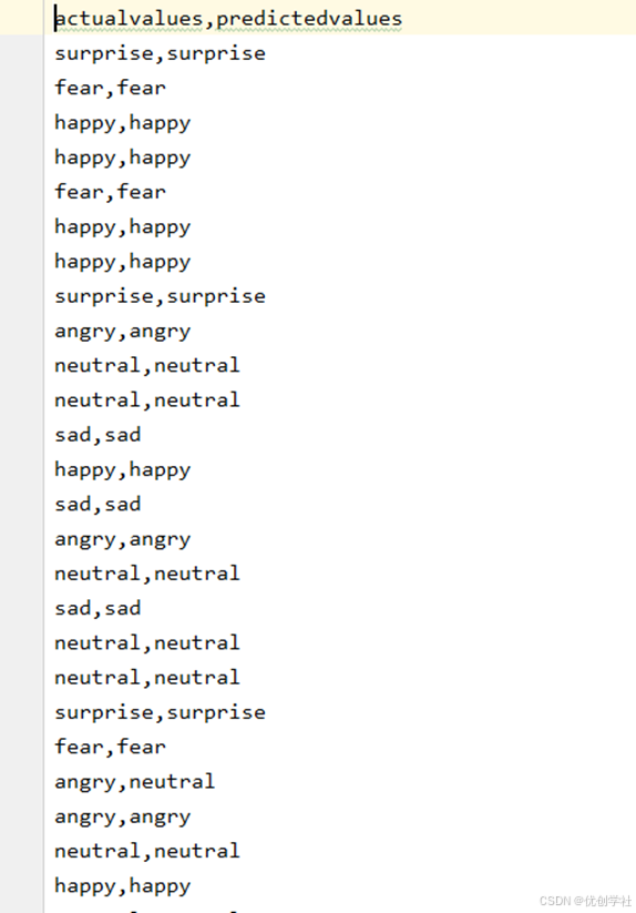 已保存的网络模型,对测试数据集进行测试,得到预测语音情绪的结果。如下图 3-14 所示。预测结果如下图 3-15 所示。