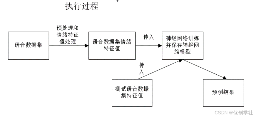3.此次实验主要采用的神经网络是卷积神经网络cnn。实验的运行过程:首先对语音数据集进行预处理,然后提取出不同情绪语音的特征值(MFCC),然后写出其处理这些特征值的神经网路模型,使用准备好的训练数据集对其训练和测试。然后保存训练完成的网络模型,再用准备好的测试集,让神经网络对其测试,得到测试结果。系统工作原理图如图 1-1 所示。