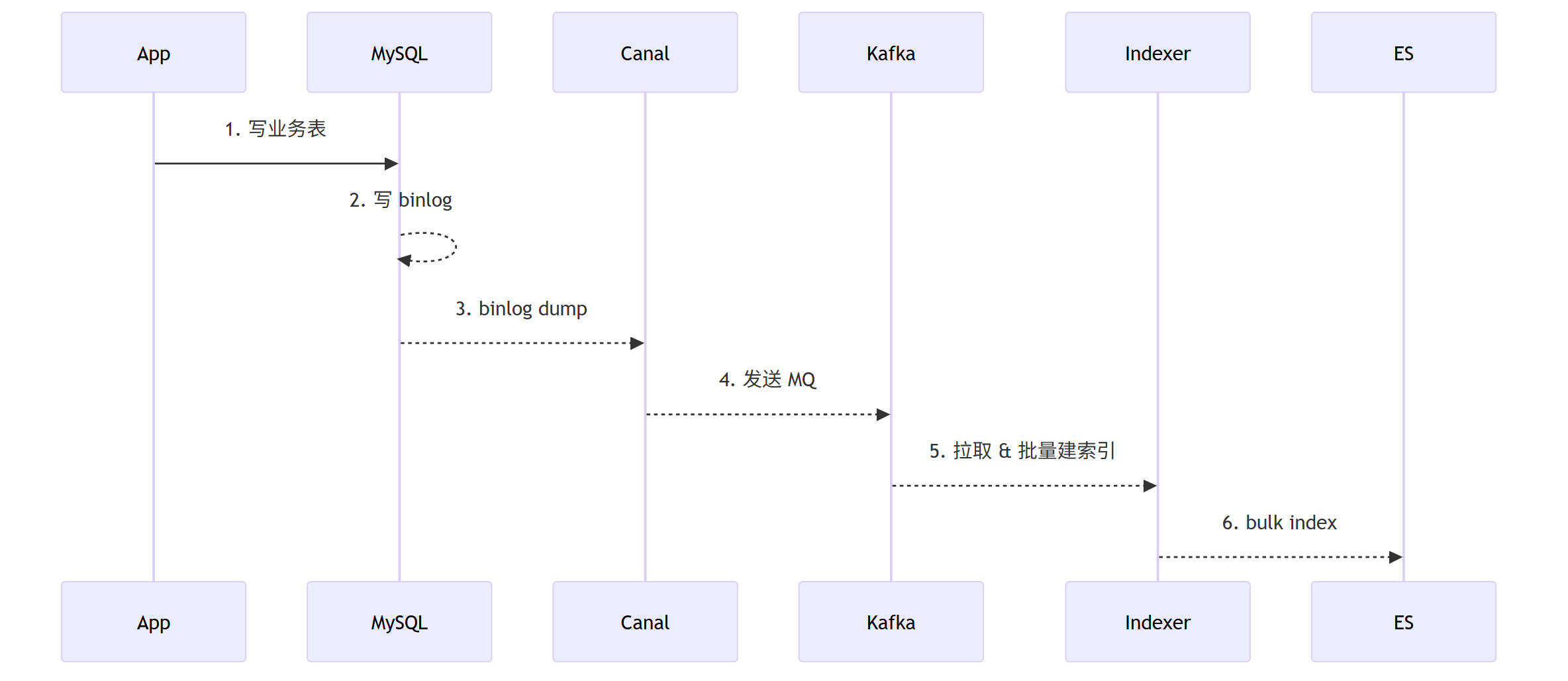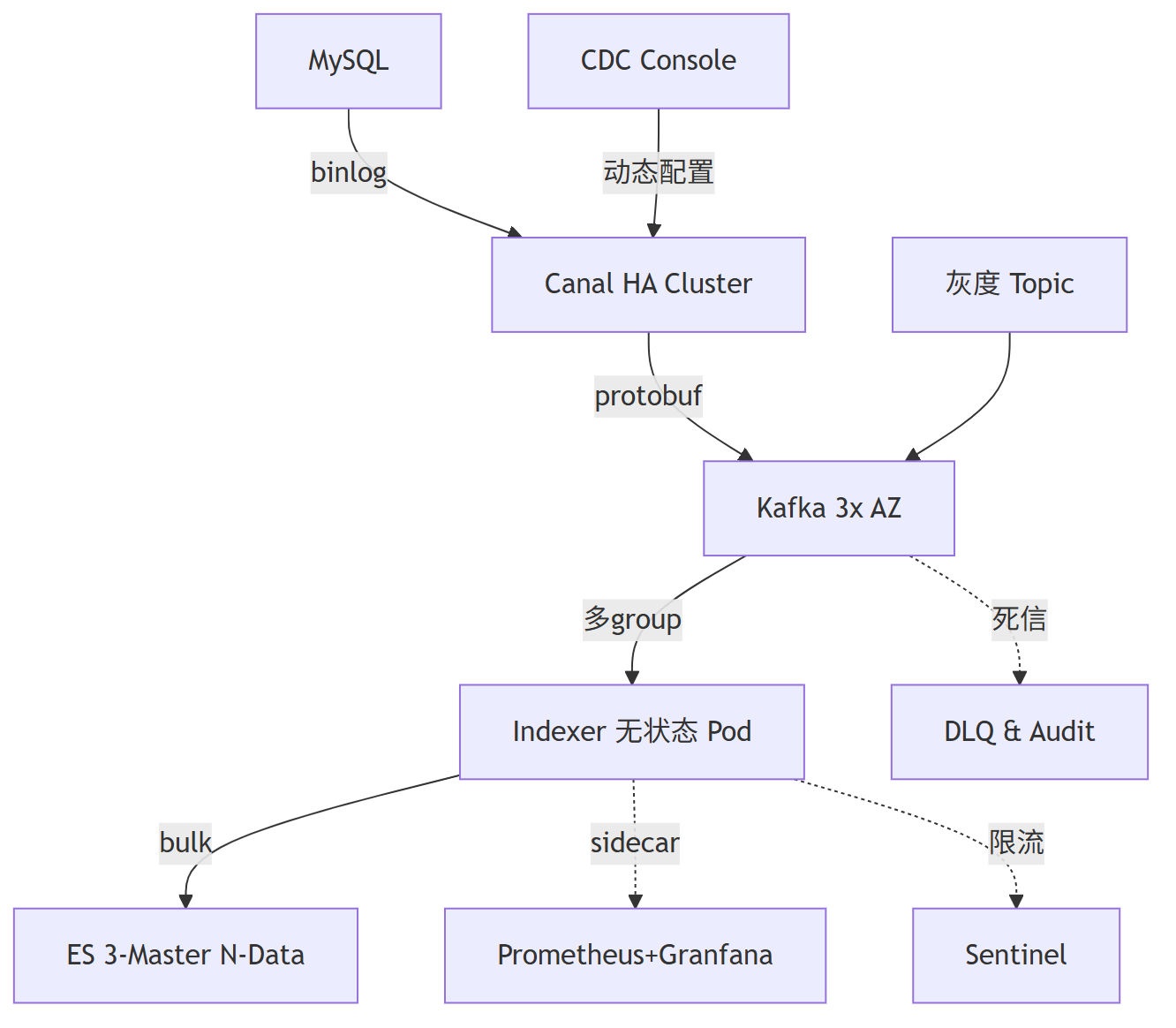 | Indexer消费 | 10毫秒到分钟 | 批量策略/ES负载/背压控制 |