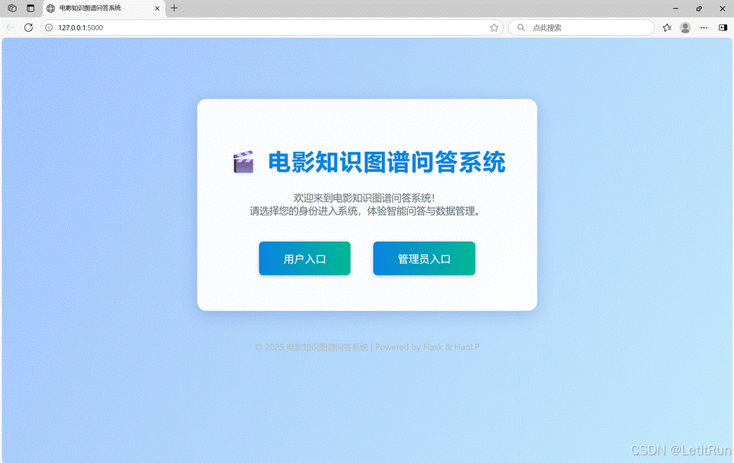 在问答系统入口Web界面可以选择用户入口和管理员入口,用户入口进入用户问答界面,管理员入口进入数据管理界面。