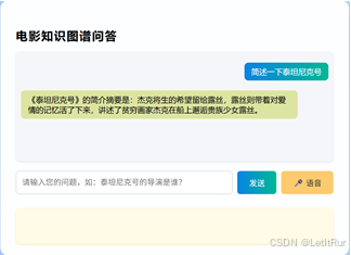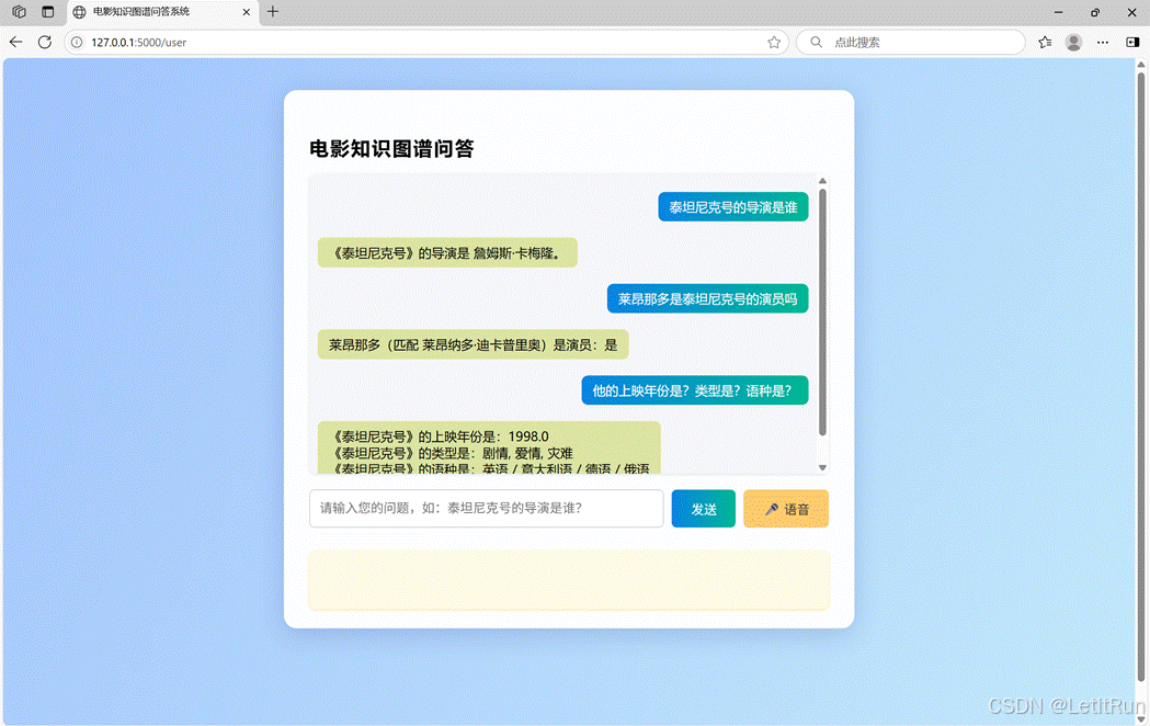 本系统是一个综合性的电影信息管理与智能问答平台,集成了电影数据管理、关系提取、实体识别、自然语言处理、情感分析和智能推荐等功能。系统能够处理结构化与非结构化的电影数据,支持多种用户交互方式,包括文本输入和语音输入,并提供丰富的电影相关信息查询功能。