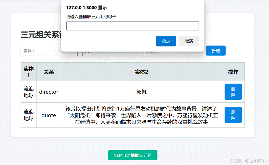 在用户(管理员)输入的语句中提取出实体关系对,并将其返回csv文件。 |