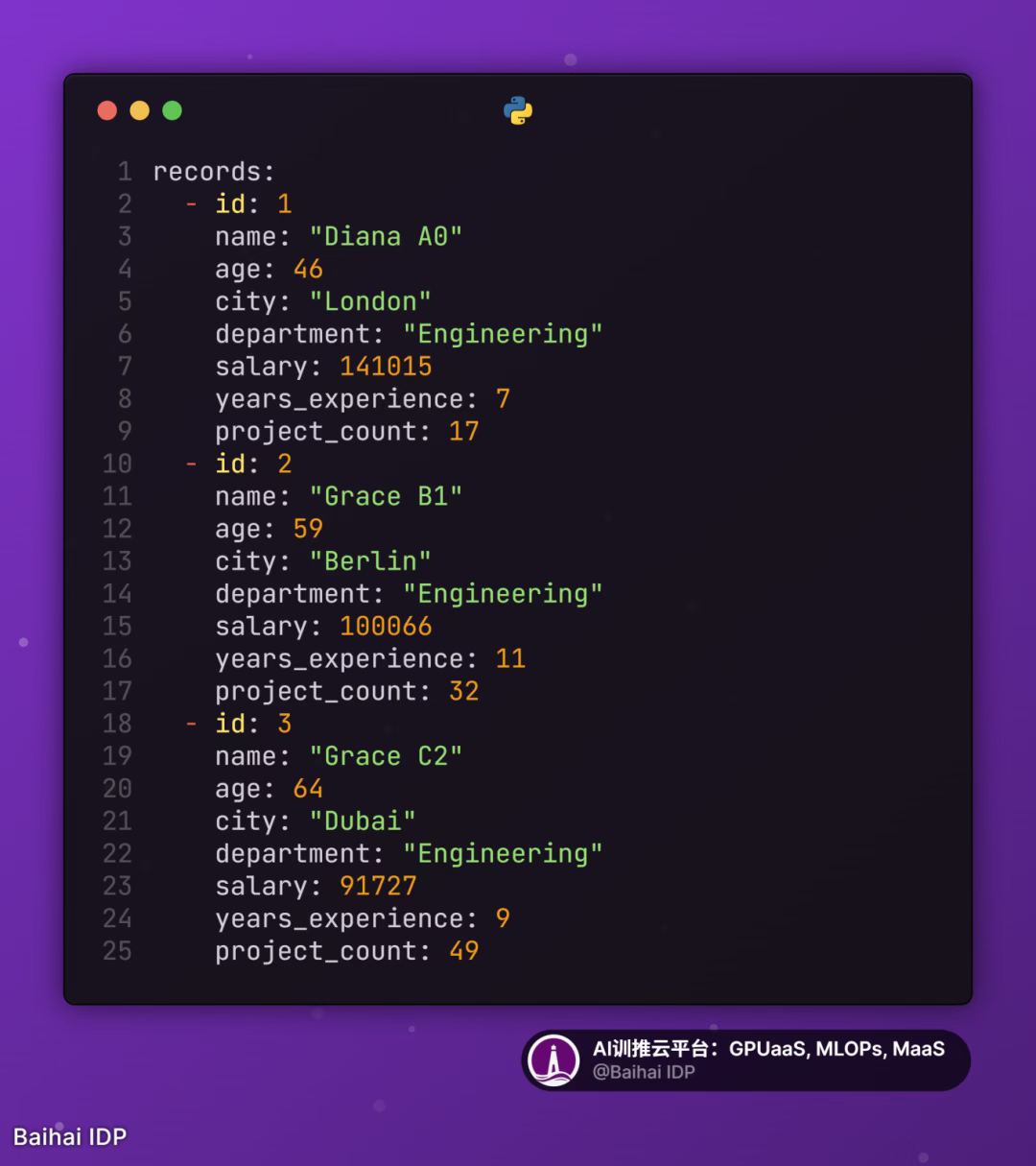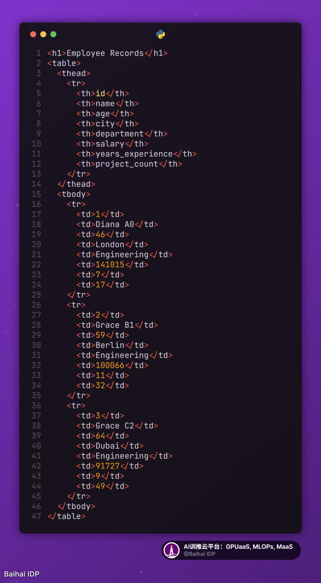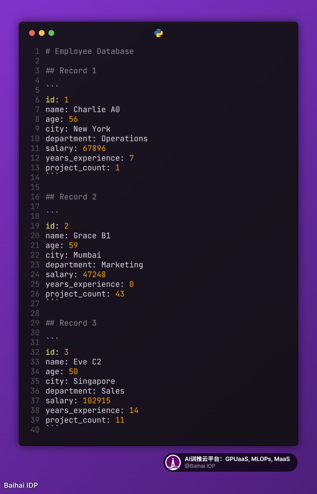 - 数据集:包含 8 个属性(ID、姓名、年龄、城市、部门、薪资、工作经验、项目数量)的 1000 条虚拟员工记录
