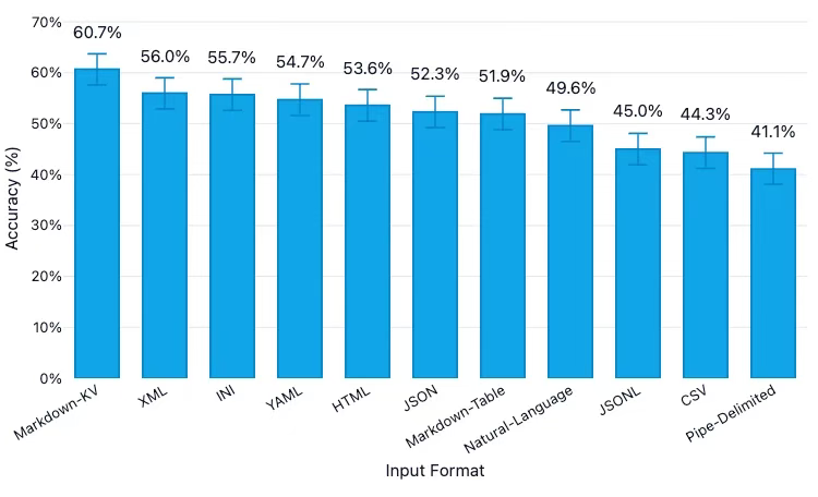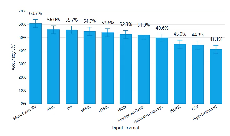 - Markdown-KV 表现最佳,准确率达到 60.7%,比 CSV 高出约 16 个百分点。(Markdown-KV 是我们对一种非标准化格式的称呼,该格式在 Markdown 中使用“key: value”键值对。)