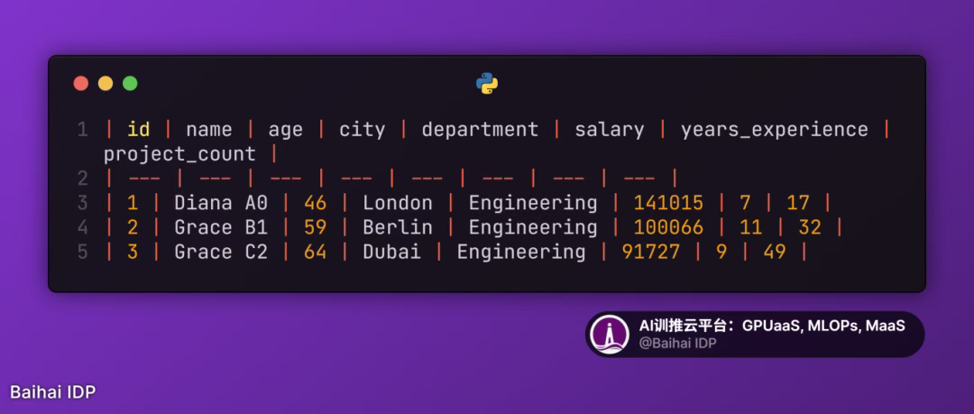 使用包含表头的表格格式(如 CSV、HTML table 和 Markdown table)时,建议定期重复表头(例如每 100 条记录重复一次)以增强理解。 为简化实验流程,本次实验未采用该做法。