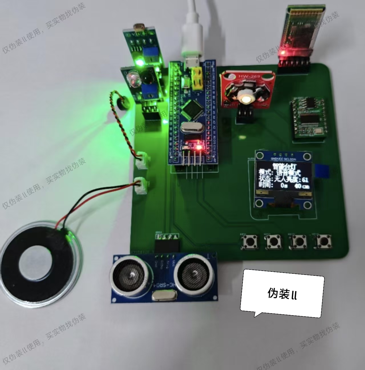 (1)本项目是智能语音台灯,主控芯片采用STM32F103C8T6,集成了亮度感应模块、红外感应模块、蓝牙模块、语音识别模块、超声波距离感应模块,可以通过当前环境下有无人和光照强度自动调节灯光亮度,并有按键模式、蓝牙遥控模式和语音识别模式