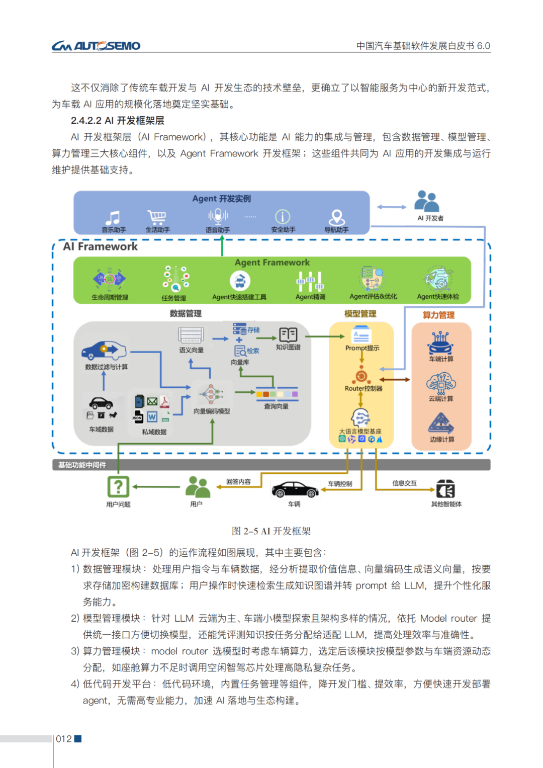 核心技术特征:包含智慧赋能底座(AI 智能体为基础)、多端动态协作(数据 / 模型 / 算力多端协调)、全向安全体系(硬件 / 固件 / 车云通信安全)、高效开发方法(低代码 / AI 辅助开发)。