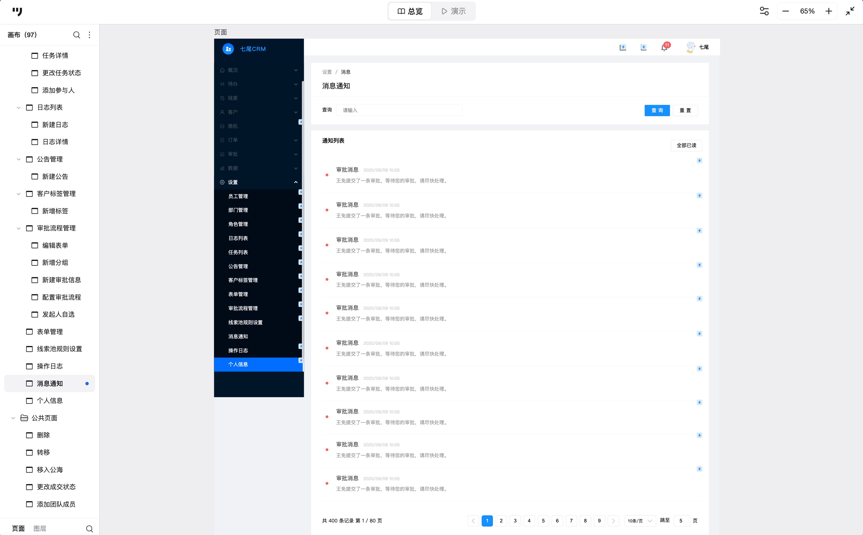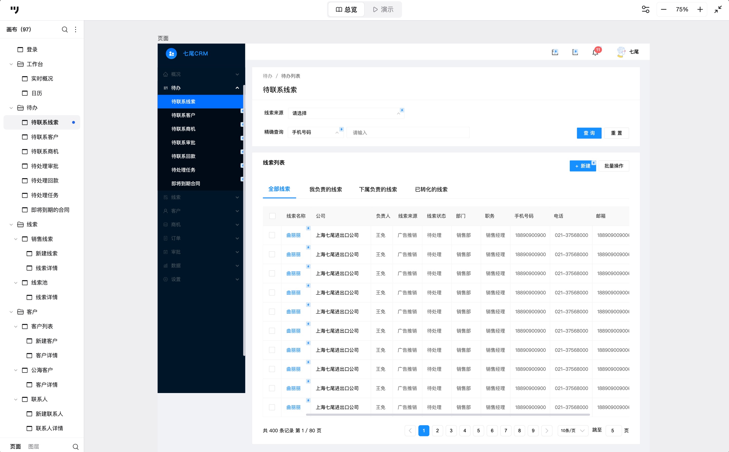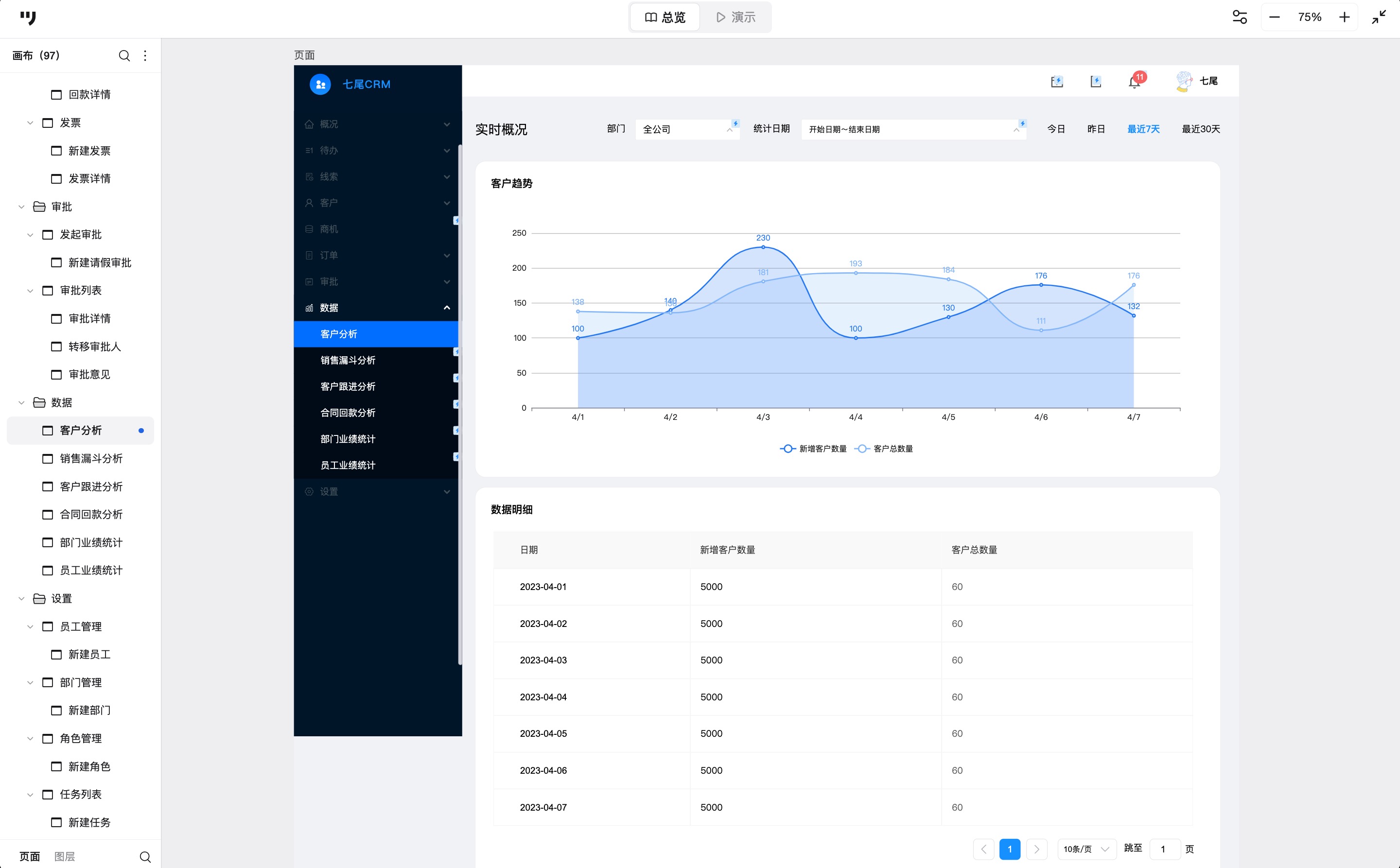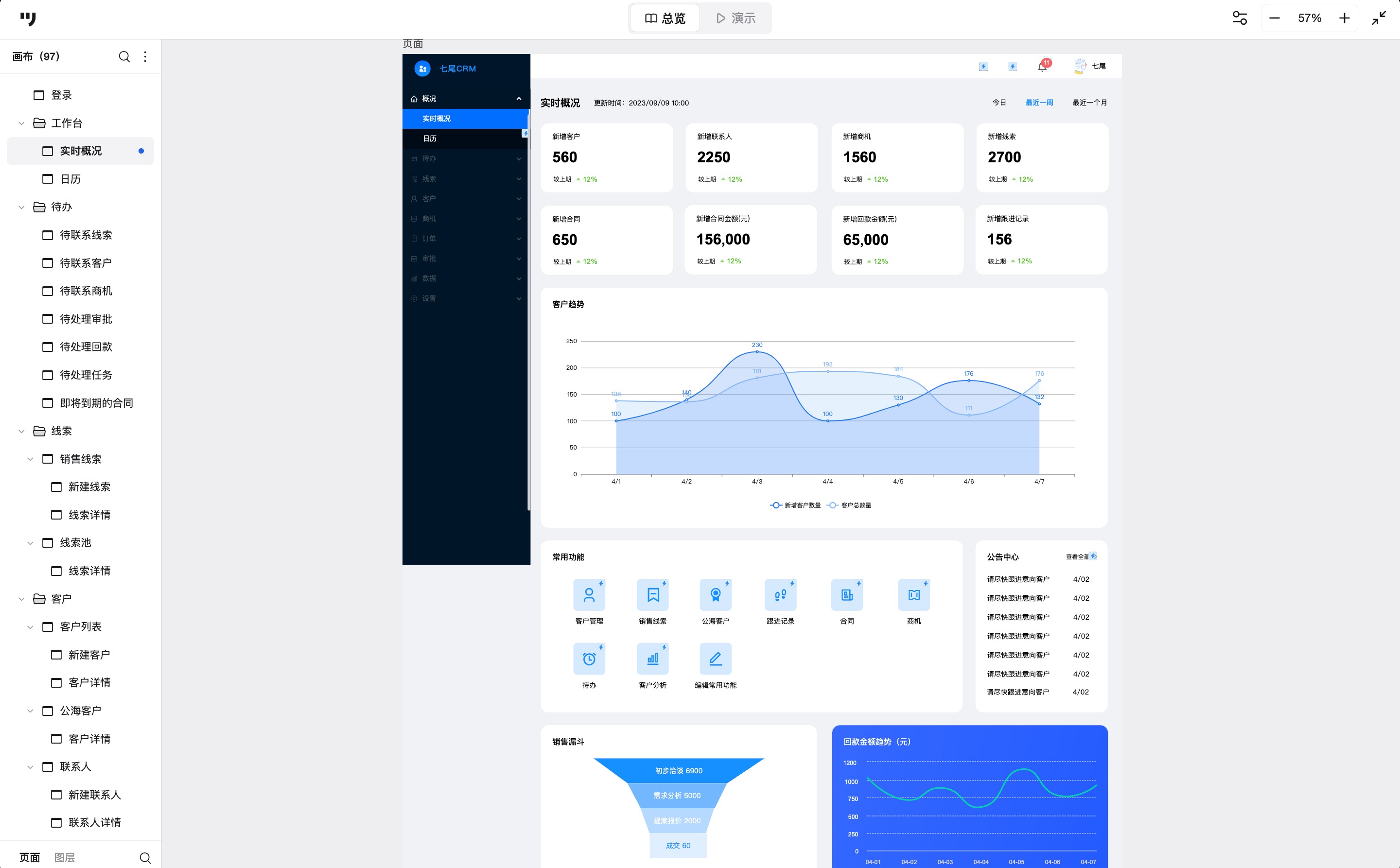 下面的案例来自墨刀素材广场的公开作品,由七尾原型工作室制作。这套原型包含CRM系统的常见模块,结构比较完整。