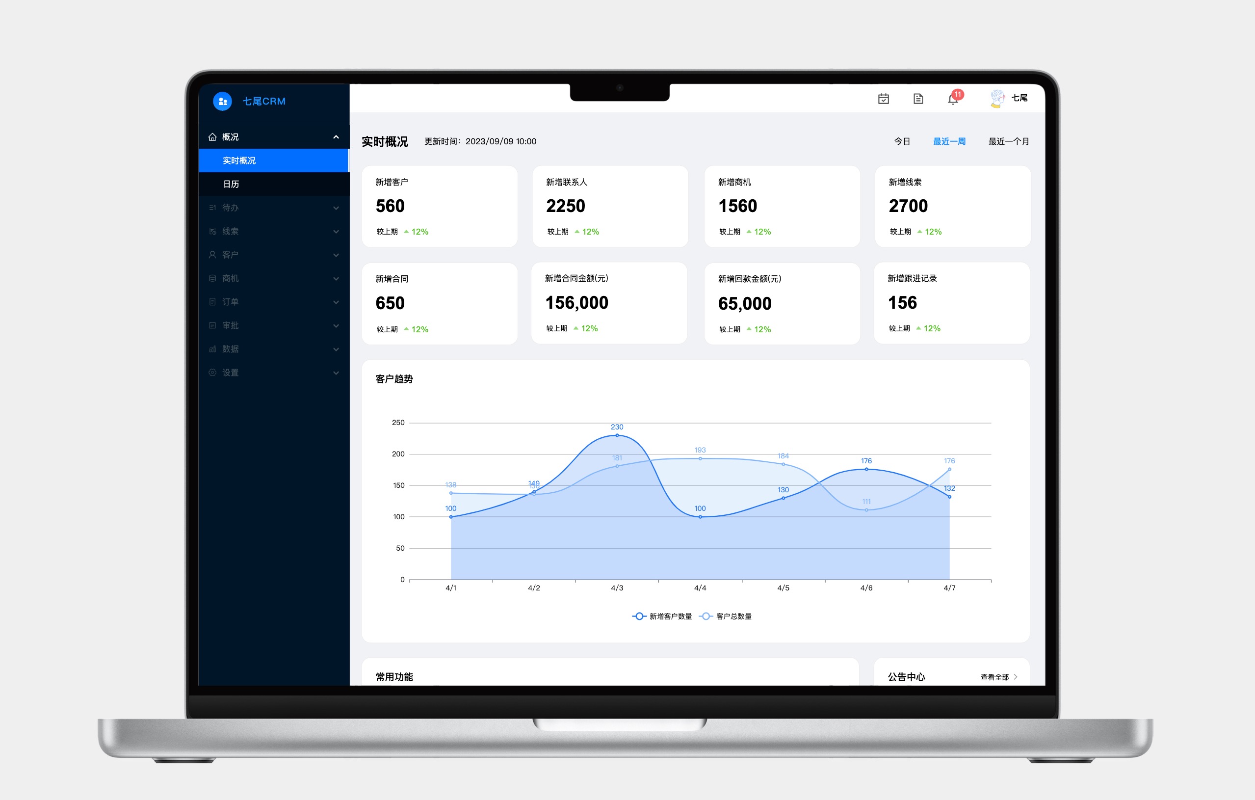 作为CRM客户关系管理系统首页,概况模块展示整体业务情况。页面上方用卡片显示新增客户、商机、合同金额、回款等核心指标,中部是客户数据趋势图,下方是公告和常用功能入口,底部配有销售漏斗和回款趋势图,支持查看今日/最近一周/最近一月不同时间段的数据。这样管理者能快速掌握全局,员工也能直接进入常用功能。另外概况模块还设有日历页面,方便查看和添加日程。