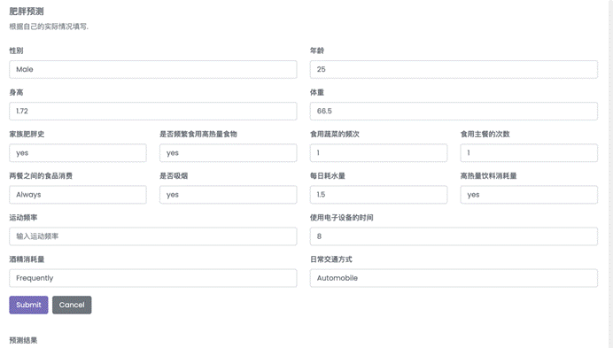 在健康管理和肥胖预测的应用中,通过输入用户特征来预测是否肥胖是一个典型的二分类问题。为了更好地理解和展示模型的预测结果,我们可以通过可视化方式来展示模型的表现。以下是通过输入用户特征预测肥胖并可视化预测结果的步骤。