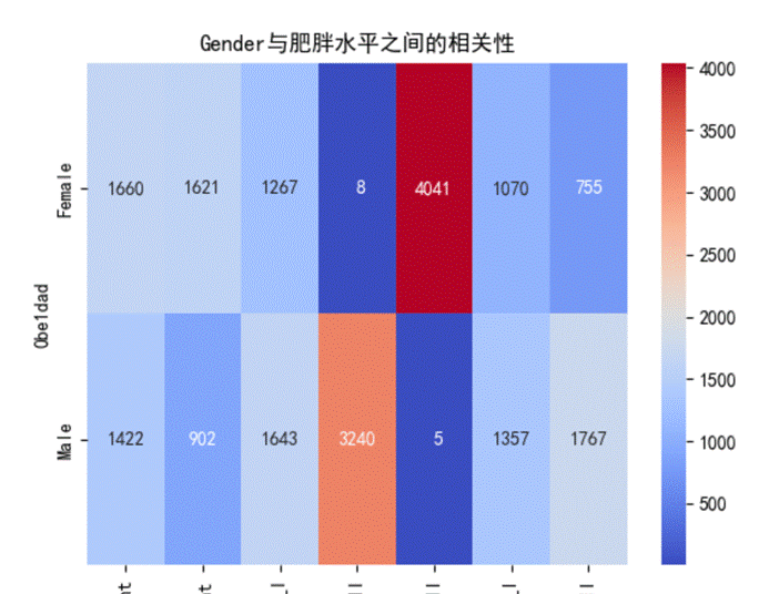 类别型变量的卡方检验与热图,对于类别型变量(如 Gender, family_history_with_overweight, FAVC 等),我们使用了卡方检验方法(通过 pd.crosstab 函数生成交叉表),通过将每个特征与目标变量 0be1dad 交叉分析,得到了每个类别组合的频率分布。这些交叉表结果通过热图(sns.heatmap)呈现,能够清晰展示不同类别与肥胖水平之间的关联强度。