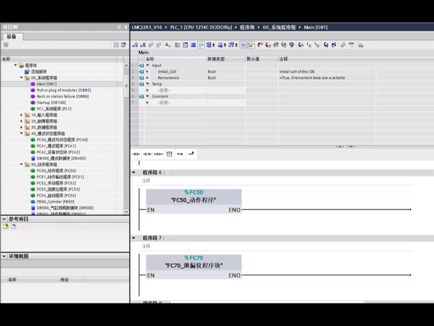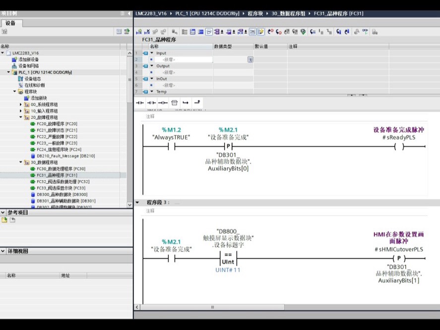 电气图里的线号标注方式更暗藏玄机:比如"1L+_K1"表示24V电源第一回路接的继电器,配合PLC里的符号寻址,查线时能直接在程序里反推物理位置。刚拿到西门子1200PLC项目模板时,我盯着030403这个神秘编号发愣——直到拆开程序结构才发现,这可能是最适合新手的实战指南。PLC程序设计的标准,包括程序结构如何划分,动作流程图怎么画,回原点应该怎么做,程序的标签,注释等命名标准,一些安全互锁动作
