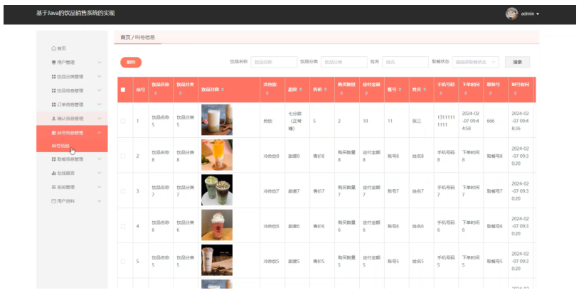 管理员点击“叫号信息管理”会显示出所有的叫号信息管理,支持输入饮品名称、饮品分类、规格、姓名、取餐状态等,进行搜索,同时可以选择某一条叫号信息,点击“删除”进行删除,也可以点击后面的“通过”按钮对叫号信息管理进行更新维护。如图5-13所示: