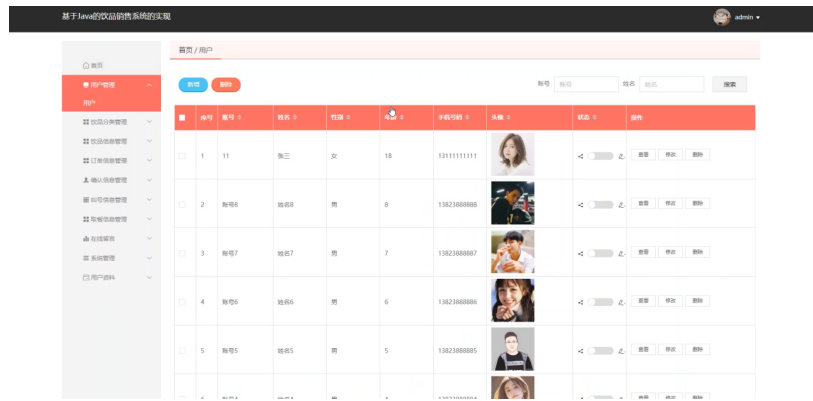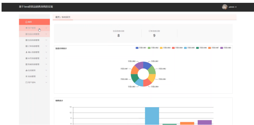 管理员进入系统主页面,主要功能包括对首页、用户管理、饮品分类管理、饮品信息管理管理、订单信息管理、确认信息管理、叫号信息管理、取餐信息管理、在线留言、系统管理、用户资料等进行操作。管理员主页面如图5-8所示:
