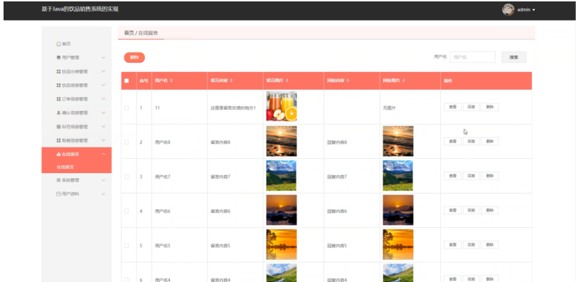 管理员点击“在线留言”会显示出所有的在线留言,支持输入用户名,进行搜索,同时可以选择某一条在线留言,点击“删除”进行删除,也可以点击后面的“回复”按钮对在线留言进行更新维护。如图5-14所示: