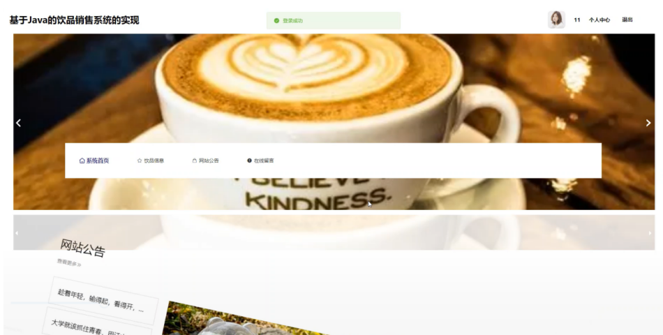 注册账号成功且登录系统后,用户即可进入主页查看系统首页、饮品信息、网站公告、在线留言、个人中心,并开始执行业务操作,如图5-1所示:
