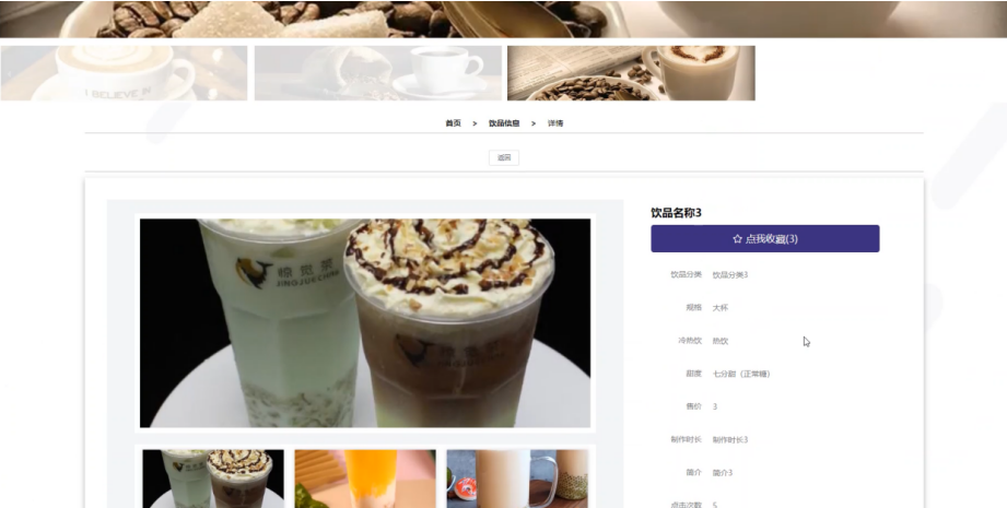 用户可通过饮品信息页面输入饮品名称,进行查询,可以查看饮品信息等具体信息,还可以进行立即购买或收藏等操作,如图5-5所示: