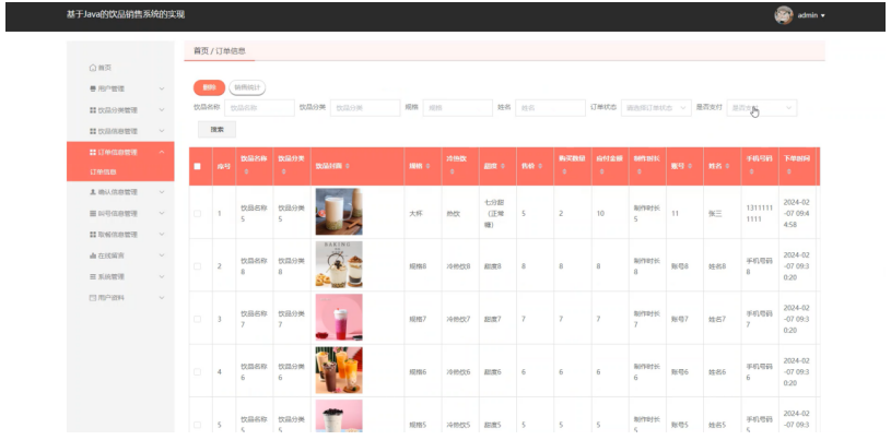 管理员点击“订单信息管理”会显示出所有的订单信息管理,支持输入饮品名称、饮品分类、规格、姓名、订单状态、是否支付等,进行搜索,同时可以选择某一条订单信息管理,点击“删除”进行删除,也可以点击后面的“通过”按钮对订单信息管理进行更新维护。如图5-12所示: