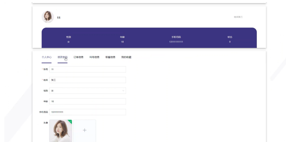 个人中心页面可通过输入修改密码、订单信息、叫号信息、取餐信息、我的收藏具体信息等操作,如图5-4所示: