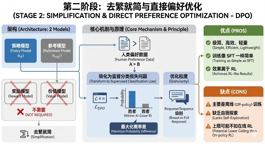 地位:针对 RLHF 复杂流程的“革命者”,大大降低了对齐门槛。
