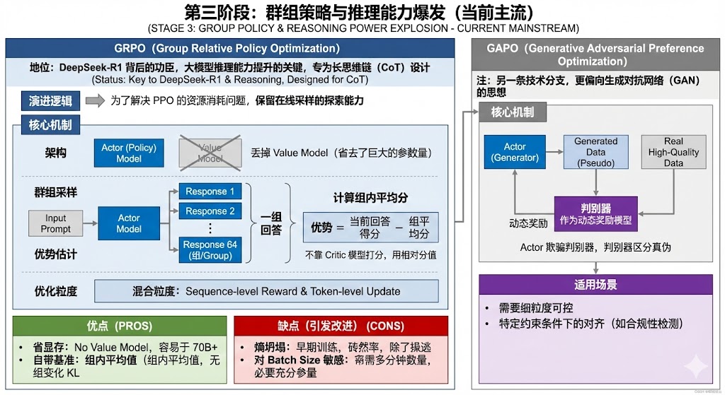 GRPO 回归正统 RL 但扔掉了沉重的包袱(Value Model),利用“群体智慧”(Group Sampling)成为推理模型首选;
