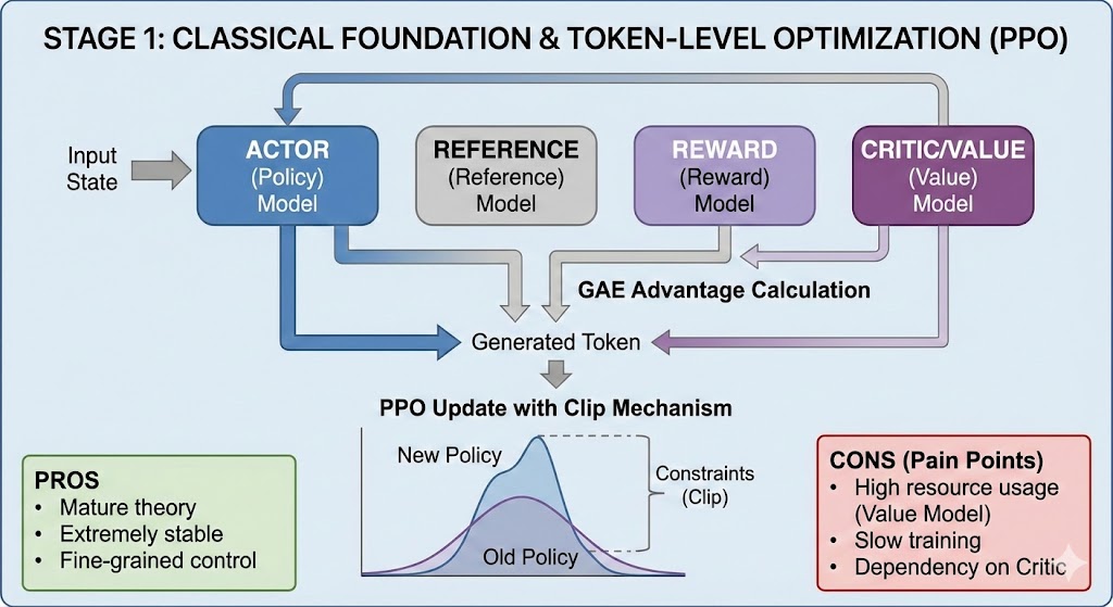 优化粒度:Token 级别。每生成一个 token 都要计算优势(Advantage),通过 GAE(广义优势估计)来平衡偏差和方差。