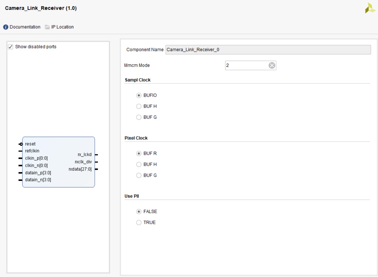 - Vivado → IP Catalog → CameraLink Receiver / Transmitter → 设置 D/N/时钟参数 → Generate - 引脚约束