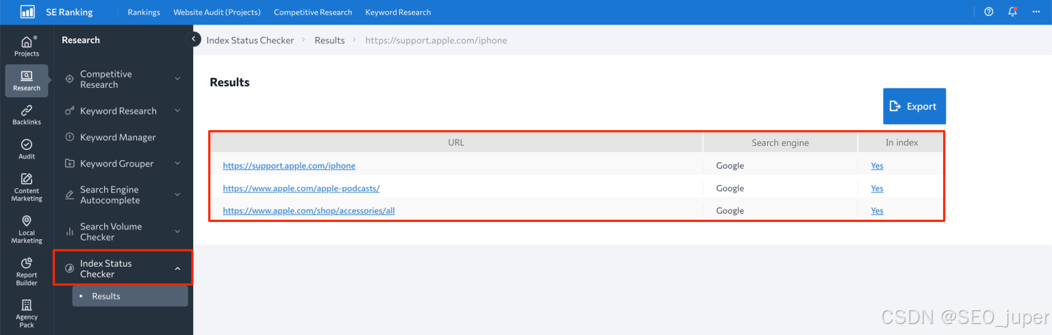 要快速检查不同搜索引擎的索引状态,请使用SE Ranking的索引状态检查工具。