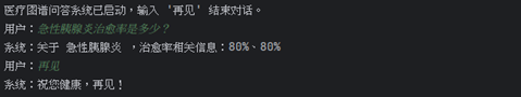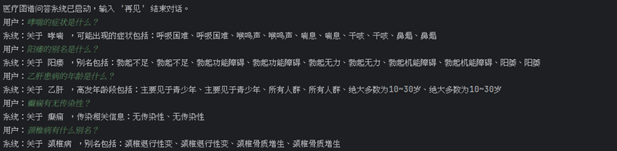 在Python中通过读取用户输入,提取疾病名称,提取所问关键词,匹配对应的Cypher语句,连接TuGraph获得查询结果,格式化输出实现对话系统。