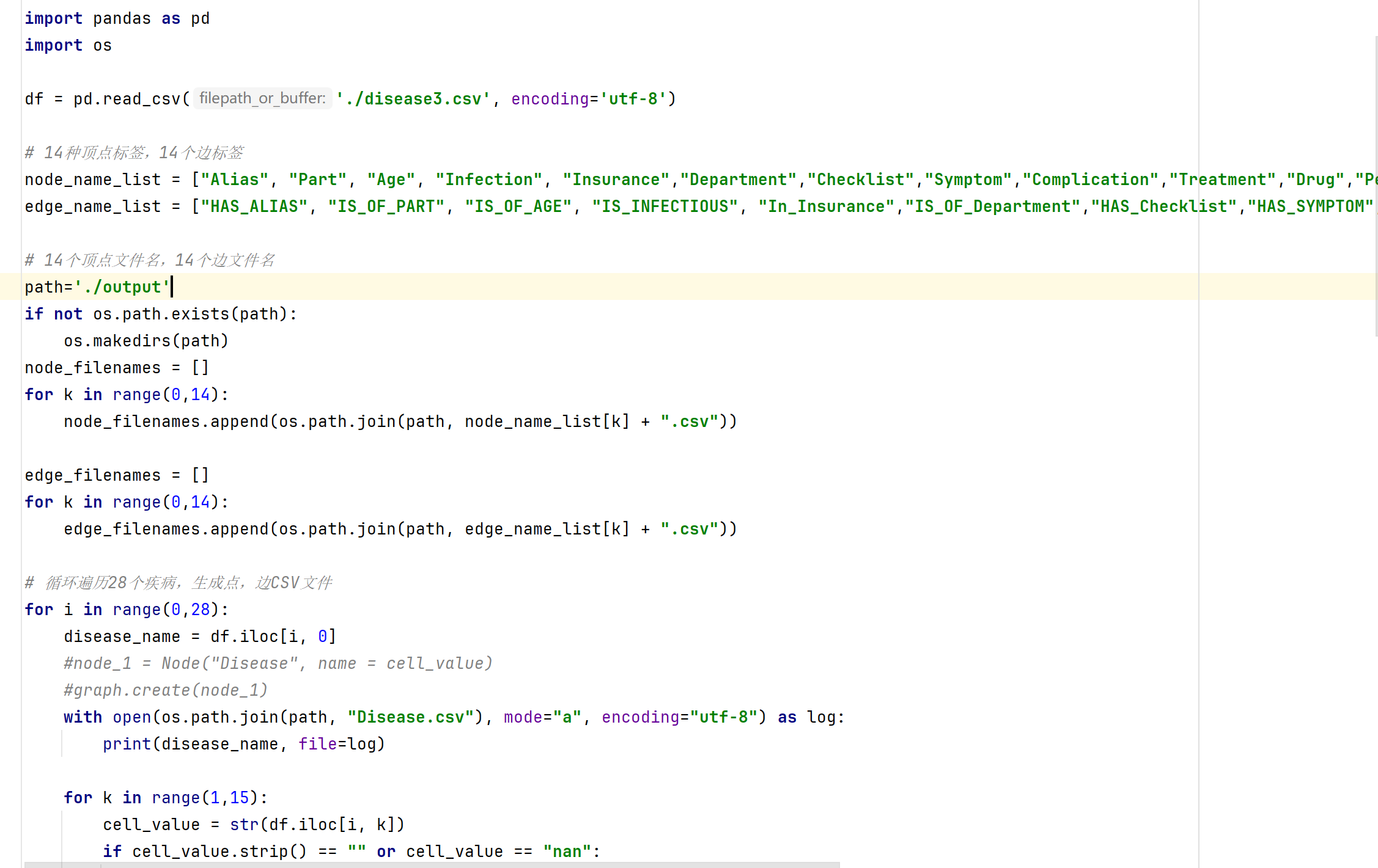 这样导入数据有个问题,就是一些字段连在一起,比如说别名“勃起功能障碍 勃起机能障碍 勃起无力 阳萎 勃起不足”是连在一起作为一个节点的,而我们希望是分开作为多个节点。所以运行write_V_E_files.py,将disease3.csv转成多个csv文件,再导入。
