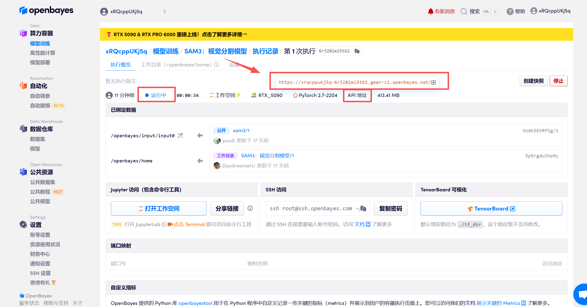4.等待分配资源,首次克隆需等待 3 分钟左右的时间。当状态变为「运行中」后,点击「API 地址」旁边的跳转箭头,即可跳转至 Demo 页面。请注意,用户需在实名认证后才能使用 API 地址访问功能。