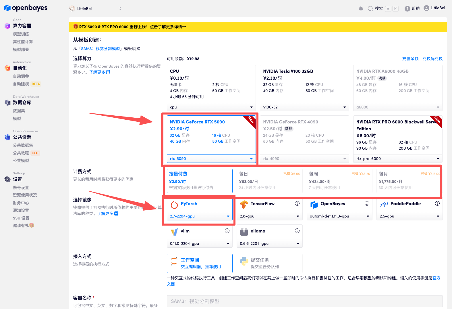 3.选择「NVIDIA GeForce RTX 5090」以及「PyTorch」镜像,按照需求选择「按量付费」或「包日/周/月」,点击「继续执行」。新用户使用下方邀请链接注册,可获得 4 小时 RTX 5090 + 5 小时 CPU 的免费时长!