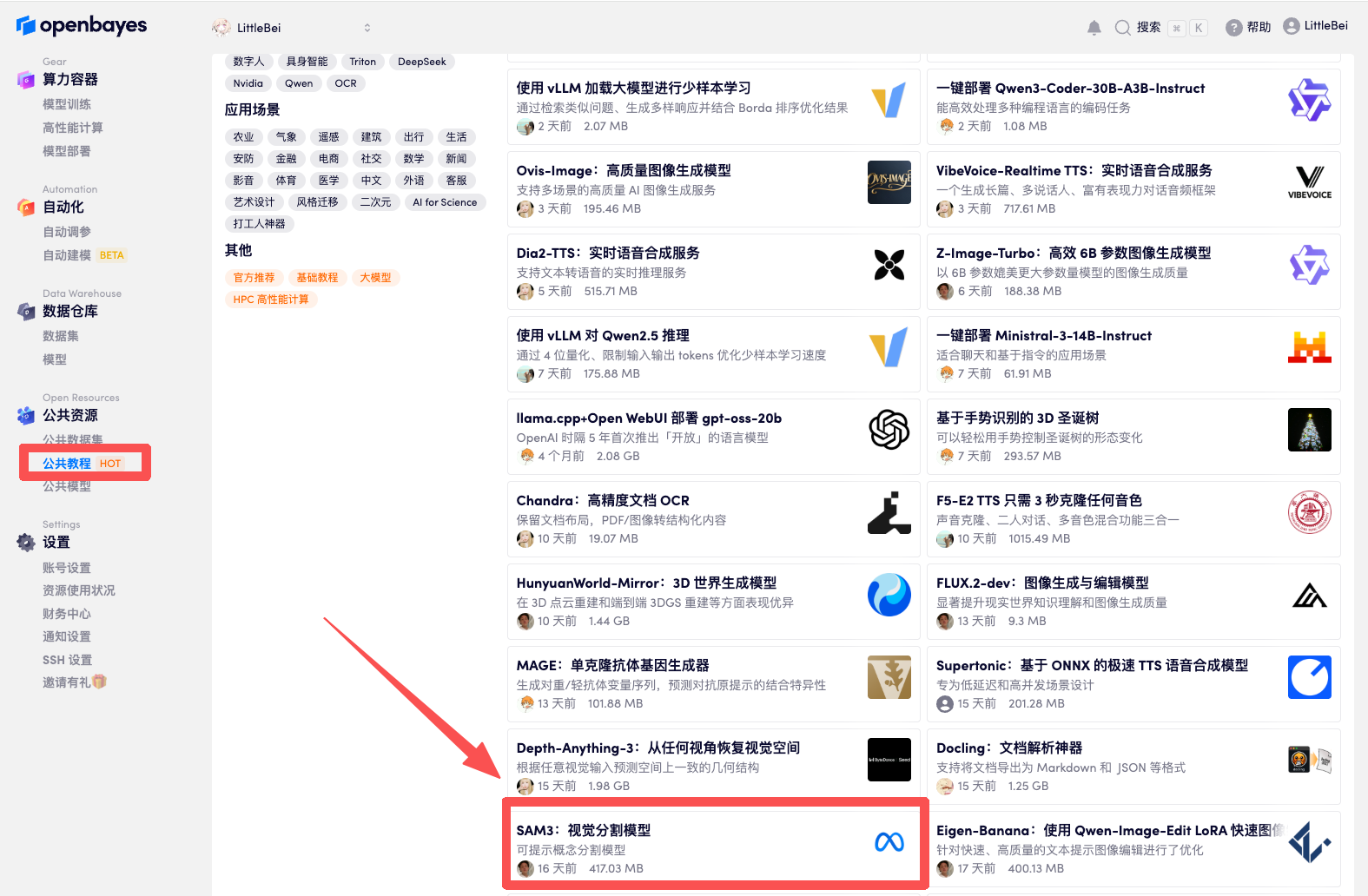 1.登录 http://OpenBayes.com,在「公共教程」页面,选择「SAM3:视觉分割模型」教程。