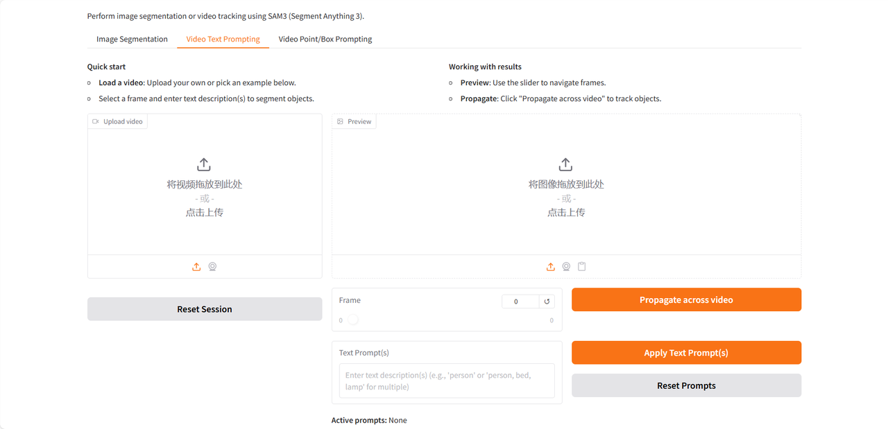 Demo 运行页面提供 Image Segmentation、Video Text Prompting、Video Point/Box Prompting 三个功能,仅支持英文输入。本教程以 Video Text Prompting 为例。
