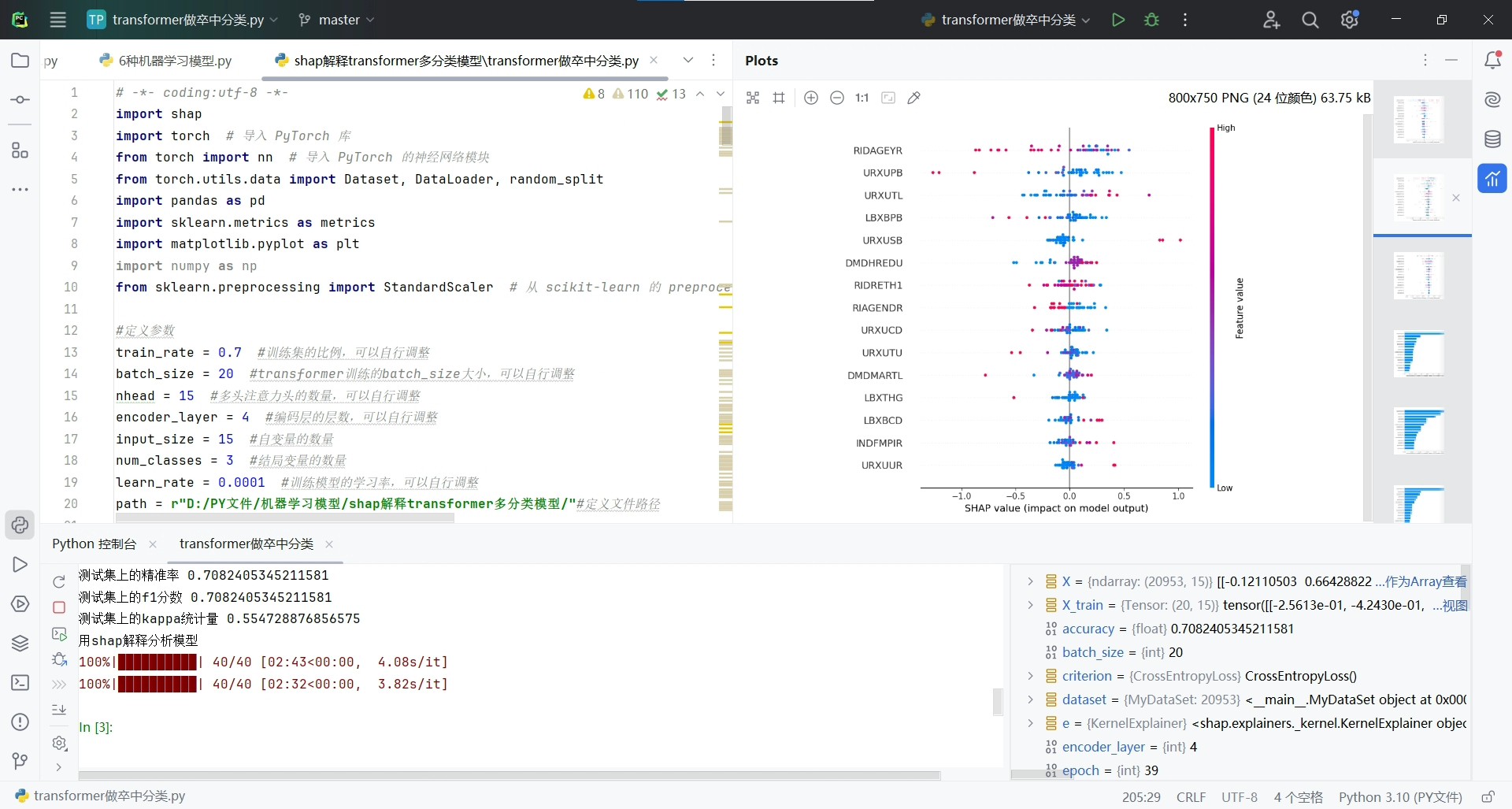Shap解释Transformer多分类模型,并且基于shap库对transformer模型(pytorch搭建)进行解释,绘制变量重要性汇总图、自变量重要性、瀑布图、热图等等因为是分类模型,所以只用到了Transformer的Encoder模块,使用了4层encoder和1层全连接网络的结果,没有用embedding,因为自变量本身就有15个维度,而且全是数值,相当于自带embedding代码架