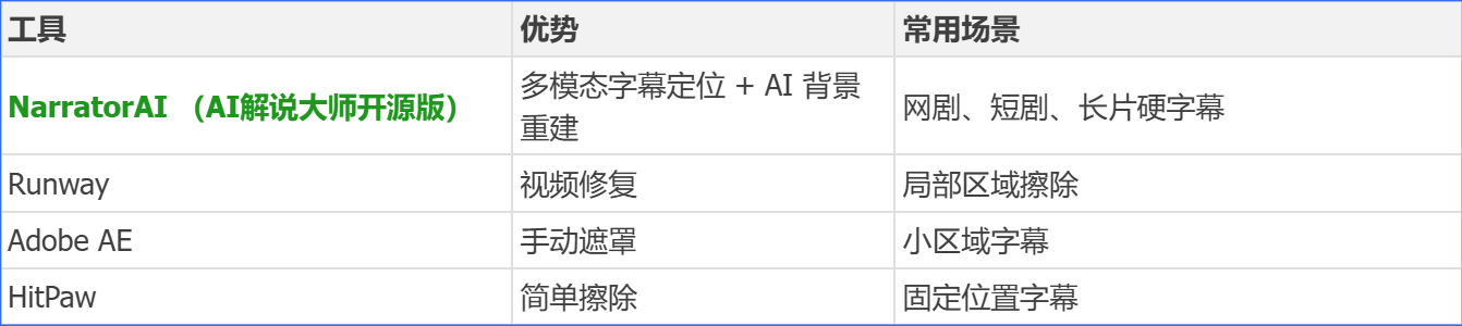 Runway:适合小区域擦除 Adobe AE:手工能力强,但耗时 HitPaw:适合固定位置字幕