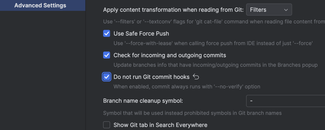 新增设置,允许指示 IDE 在执行提交操作时跳过运行 Git 钩子。