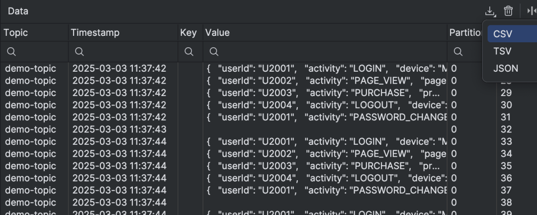 Kafka: 允许将 Kafka 记录直接导出为 JSON、CSV 和 TSV 文件,便于数据分析、共享和问题诊断。