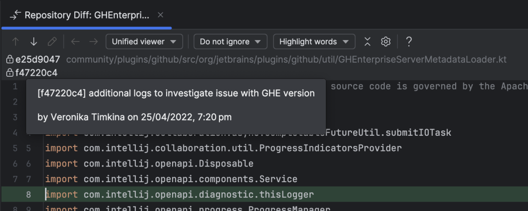 可以直接在差异视图中查看提交详情。差异对话框会显示提交信息、作者、日期时间以及完整的提交哈希值。这使您能够更清晰地了解文件的历史记录,加速对代码修改的理解。