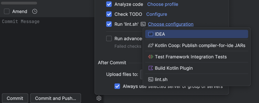 可将任何自定义工具配置为运行配置,在提交前的检查阶段(与 IDE 内置检查、格式化并行)执行。