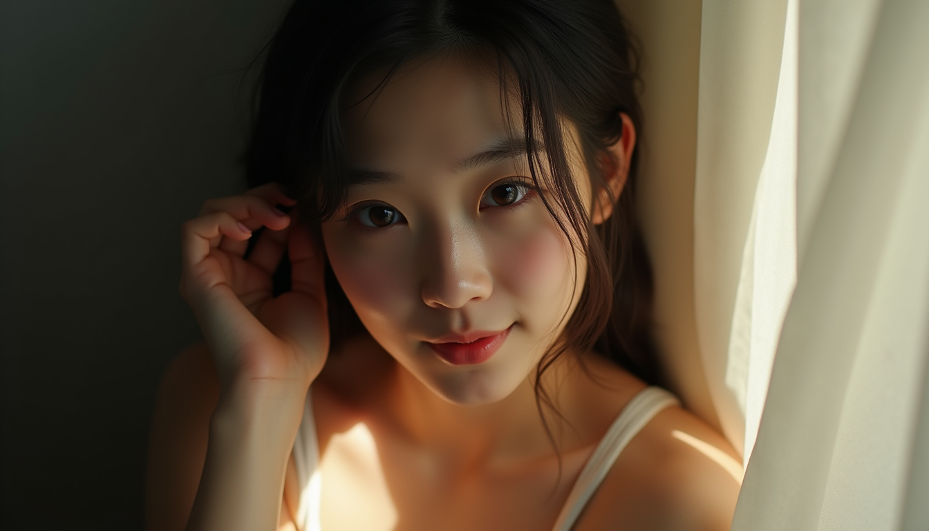 A captivating, intimate portrait of a Chinese young woman with a heart-shaped face. Her gaze is half-lidded and dreamy, holding a subtle, knowing smile that plays on her slightly parted lips. Soft window light caresses the curve of her shoulder and the line of her neck, casting long, dramatic shadows that sculpt her form. She wears simple cotton underwear; one hand drifts up to gently tuck a stray strand of hair behind her ear, a gesture of tender self-consciousness. The mood is a blend of innocent allure and quiet confidence, shot with a cinematic, film-noir sensibility, emphasizing the soft texture of her skin and the silkiness of her hair. Photorealistic, natural skin texture with fine pores and subtle blush.