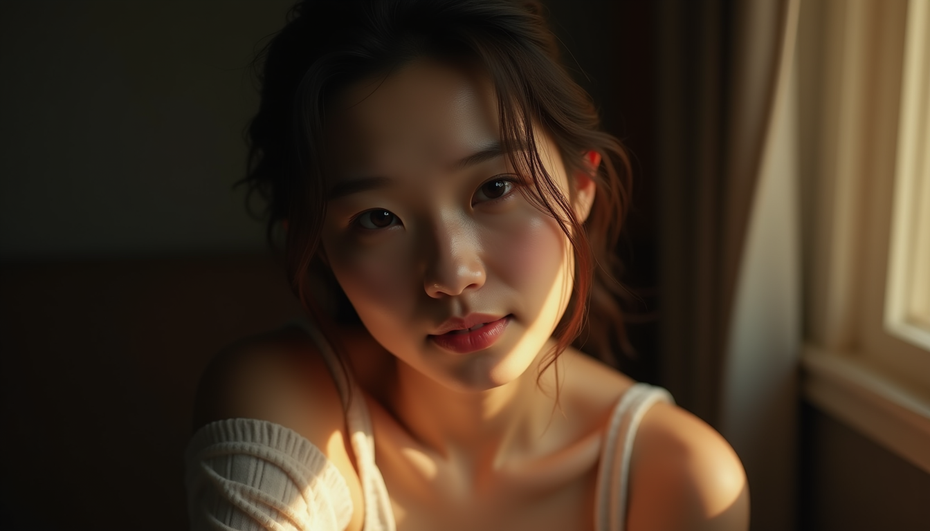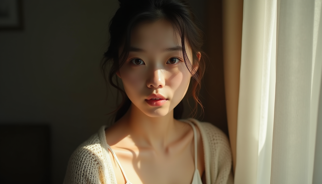 (masterpiece, best quality, photorealistic, 8k, (ultra-detailed skin:1.4)), an artistic portrait of a (Chinese young woman exuding a serene maturity and understated sensuality). (Soft afternoon light streams through a window, casting delicate shadows across her face and body). She has an (innocent face with expressive, phoenix eyes) that look directly at the viewer with (quiet confidence). Her (hair is casually tied up, with a few loose strands framing her face). She is draped in a (high-quality, light-knit cardigan over a simple camisole). (Half of her face is gently illuminated, the other half in soft shadow), creating a (mysterious and captivating chiaroscuro effect). Shot on a Fujifilm GFX 100 with a 110mm f/2 lens, (film-like tonal quality, profound sense of tranquility and unspoken allure).