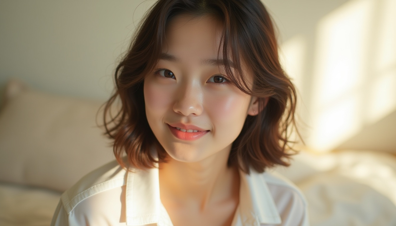 Scene theme: An 18-year-old Asian girl, with a youthful pure face and a budding feminine charm. She has slightly wavy shoulder-length hair, her makeup is almost natural, highlighting her clear eyes and moist nude lips. She is wearing a loose boyfriend-style white shirt with a slightly open collar, exposing her smooth shoulders, and is kneeling on a bed bathed in morning sunlight, smiling shyly and sweetly at the camera.