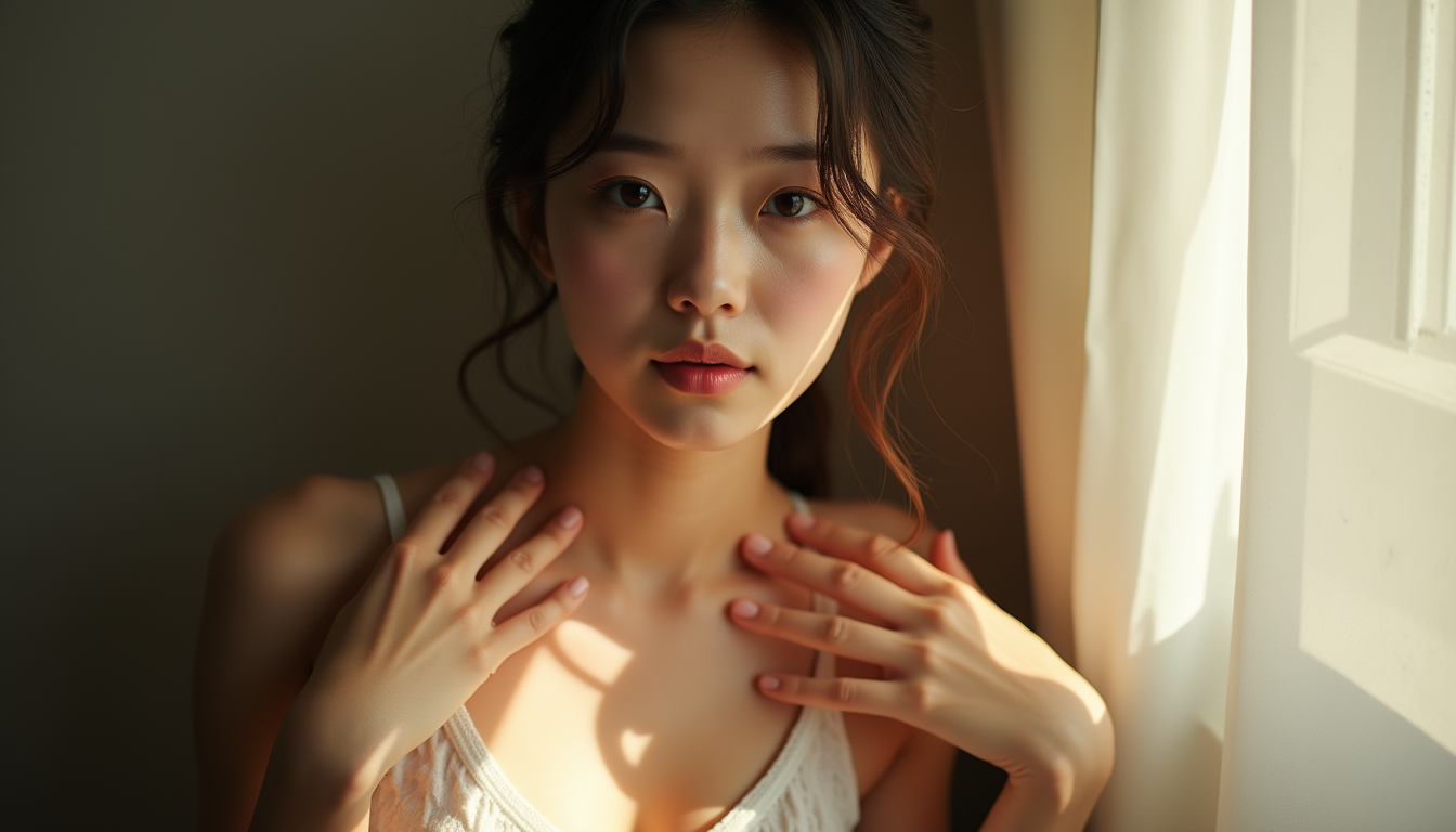 (masterpiece, best quality, photorealistic, 8k, (ultra-detailed skin:1.4)), an artistic, sensual portrait of a Chinese young woman with (a heart-shaped face and a captivating gaze). (Soft light from a window illuminates one side of her body, casting dramatic shadows that highlight her (full bust and curved waistline)). She is dressed in (simple cotton underwear), her (hands gently tracing her collarbone). The composition focuses on her (torso and face), creating an intense and personal connection. Shot on a Fujifilm GFX 100 with a 110mm f/2 lens, (high contrast, film noir ambiance), (emphasis on texture and form), (mood of quiet confidence and profound femininity).