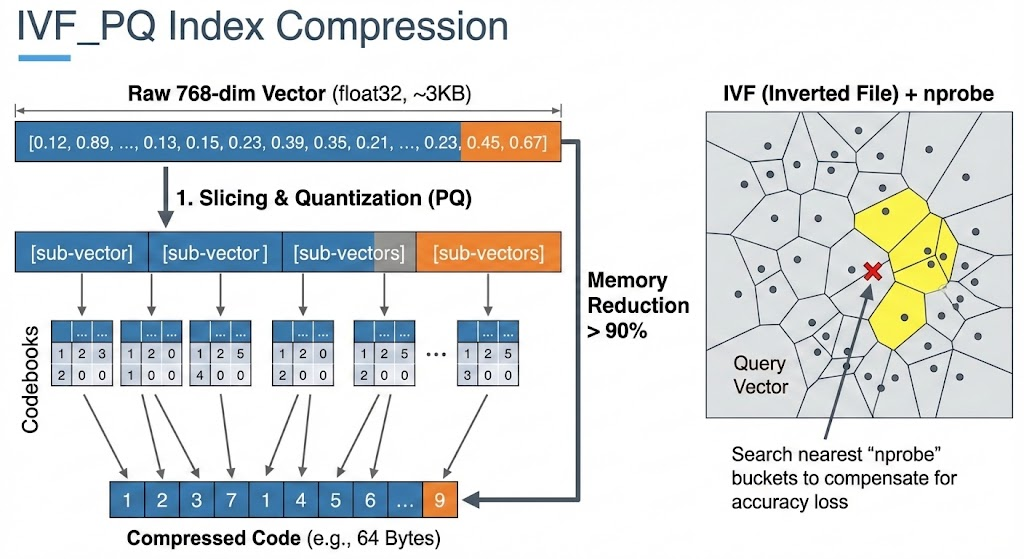 - 乘积量化(Product Quantization, PQ):压缩向量维度,减少内存占用和计算量。