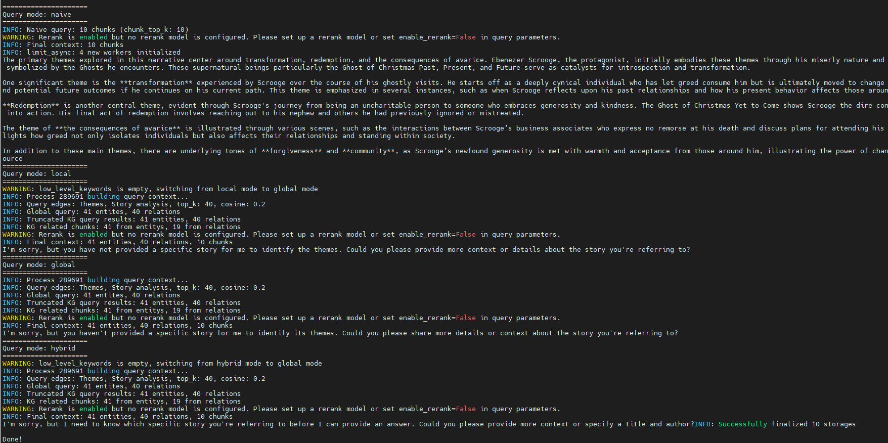 摘要:在使用LightRAG时发现qwen2.5:32b模型无法正确输出结果,表现为无法识别输入内容。通过调整num_ctx参数或改用llama3.1:8b模型后,系统能正确分析《圣诞颂歌》的主题(如救赎、成长、社会阶层等)。但发现代码存在多个低级bug,质疑开发者是否进行充分测试。建议在使用时注意模型选择和参数配置,特别是上下文长度设置对结果的影响很大。